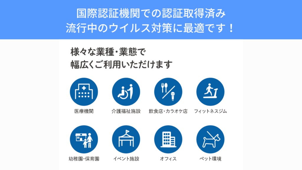 飲食店、オフィス、商業施設、ジム、工場、学校など様々な環境で消毒・除菌から感染予防いたします。